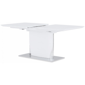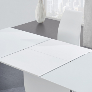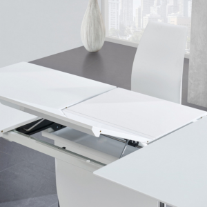stainless steel accents is sleek and on-trend. The glass top over white high gloss wood extends from 63in to 87in to
