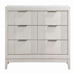 Polished chrome edge-pull hardware centers each drawer front. The antique white finish of the collection