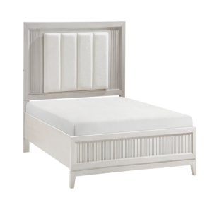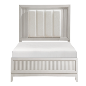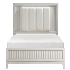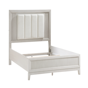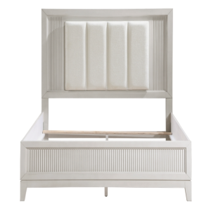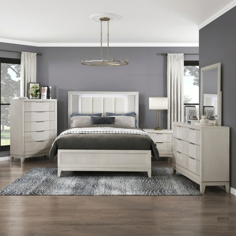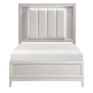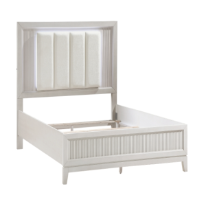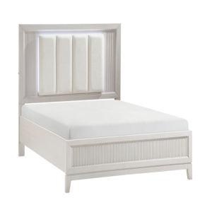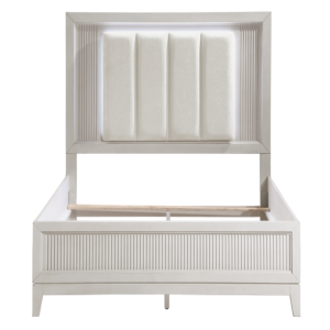 ivory-hued padded LED back-lit King headboard, and footboard. The antique white finish of the